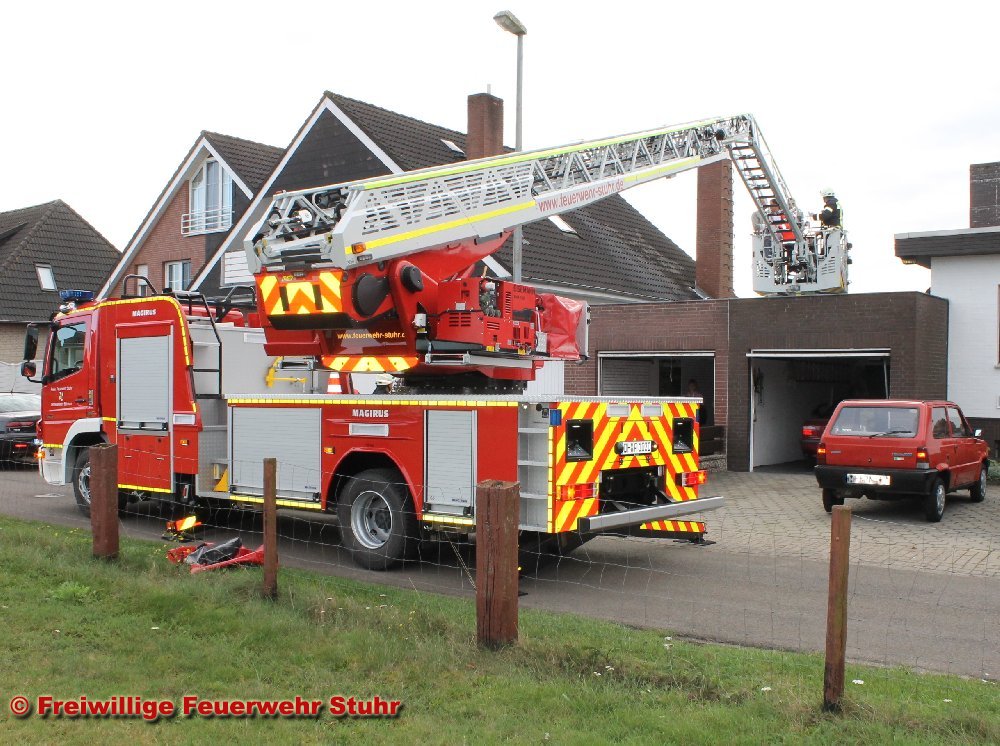 (mt) Bei Arbeiten am Dach seines Einfamilienhauses im Rosenweg ist ein Seckenhauser gestern gegen kurz vor 14:00 abgestürzt und auf dem Flachdach der angrenzenden Garage gelandet. Dabei brach sich der Mann nach ersten Erkenntnissen beide Arme oder Handgelenke, so dass er das Garagendach nicht ohne fremde Hilfe verlassen konnte. Da im ersten Moment auch von schlimmeren Verletzungen ausgegangen werden musste, alarmierte die Einsatzleitstelle neben Rettungswagen und Notarzt auch die Drehleiter aus Brinkum. Diese rückte wenige Minuten später zusammen mit einem Löschfahrzeug mit Personalreserve aus. Als die Einsatzkräfte in der Seckenhauser Wohnsiedlung eingetroffen waren, konnte der Rettungsdienst bereits Entwarnung geben. Eine patientenschonende Rettung, wie sie z.B. bei Wirbelsäulenverletzungen durchgeführt wird, musste nicht durchgeführt werden. Die Besatzung der Drehleiter holte den Verletzen, im Leiterkorb stehend, vom Dach und übergab ihn an den Rettungsdienst zur weiteren Behandlung.