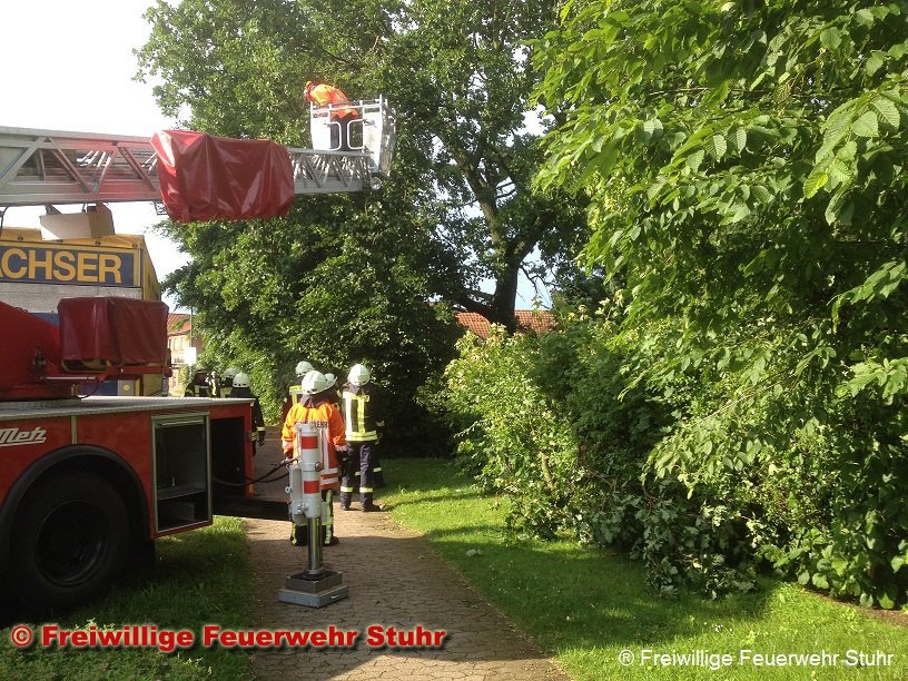 (JG) Gegen 18 Uhr wurden die Ortsfeuerwehr Brinkum über Meldeempfänger zu einer Techn. Hilfeleistung alarmiert. Dickere Äste, welche nach einem Gewitter abknickten, drohten nun in einen Garten in der Erichstraße zu stürzen. Die Ortsfeuerwehr Brinkum brachte die Drehleiter in Stellung und arbeitete sich von der Syker Straße aus mit Kettensäge zu dem Baum vor. Die Äste konnten dann sicher vom Baum getrennt werden. Im Verlauf der Arbeiten wurden die Äste abgetragen und der Garten den Anwohners geräumt. Der Einsatz konnte nach ca. anderthalb Stunden beendet werden und die Einsatzkräfte zurück zum Feuerwehrhaus.