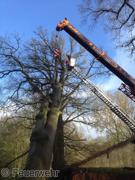 Das Aprilwetter mit Sturmböen führte zu einem TH Einsatz im Langen Weg in Groß Mackenstedt. Eine große Buche mit ca. 1,30m Stammdurchmesser wurde entwurzelt und drohte auf eine Scheune zu stürzen. In der Scheune befanden sich ca. 15 Rinder, die mit Hilfe der Feuerwehr in Sicherheit gebracht wurden. Der Einsatzleiter forderte umgehend die Drehleiter aus Brinkum sowie einen 60t Autokran einer Privatfirma an. In mühevoller Arbeit wurde zunächst Platz für den Kraneinsatz freigesägt. Durch Zusammenwirken von Kran, Drehleiter und Rüstwagen, konnte der Baum ohne weitere Schäden, hinter den Gebäuden abgelegt werden. Nachdem die unmittelbare Gefahr für Tiere und Gebäude abgewendet war, wurde der Feuerwehreinsatz beendet und die Einsatzstelle an den Besitzer übergeben.