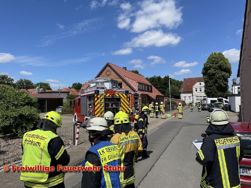 (ct) Knappe zwei Stunden später kam es zu einer weiteren größeren Alarmierung in der Gemeinde Stuhr. Um 12:34 Uhr wurden die Feuerwehren Brinkum, Gr.Mackenstedt und Seckenhausen, sowie der Einsatzleitwagen aus Fahrenhorst die gefahrgutstaffel Nord aus Syke und die Messgruppe Nord mit Fahrzeugen aus Sudweyhe und Barrien über Sirene und Meldeempfänger mit dem Stichwort „Gas-Austritt“ alarmiert. Zur Unterstützung des einsatzleiter war ebenfalls der Gefahrstoffberater Nord am Einsatzort. Einsatzort war die Neuenstraße im Ortsteil Brinkum. Bei unterirdischen Verlegearbeiten für das Glasfasernetz mit einem Bohrgerät wurde eine größere Gasleitung beschädigt und Gas trat aus.