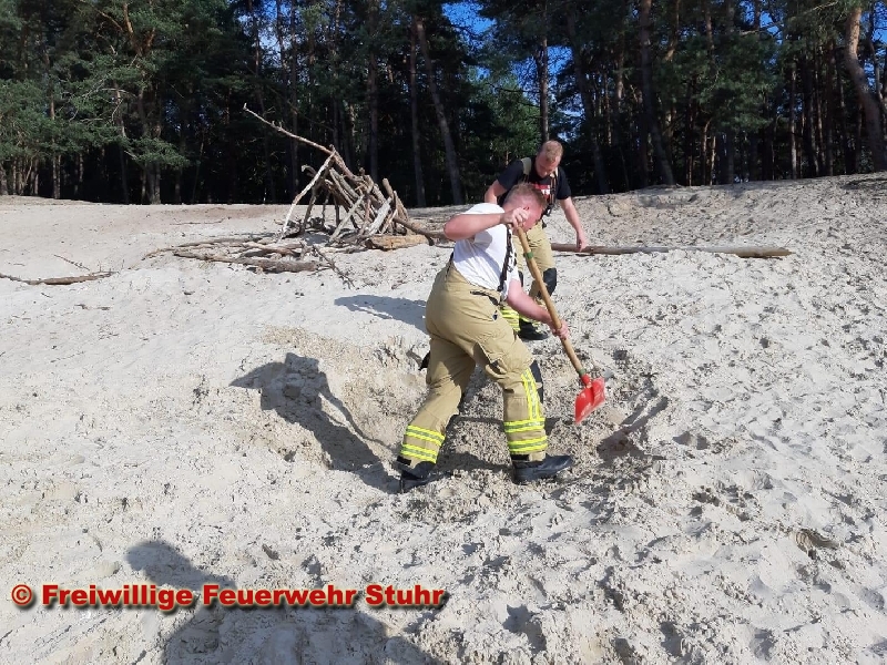 Ein 11-jähriger Junge war beim Spielen in eine selbst gegrabene Höhle im Sand geklettert. Im Spielen brach dann die Höhle zusammen und verschüttete den Jungen. Beim Eintreffen der Feuerwehr war der Junge bereits durch Begleitpersonen gerettet worden und konnte an den kurz darauf eintreffenden Rettungsdienst übergeben werden. Da er aber einige Minuten eingeschlossen war, wurde er anschließend zur weiteren Behandlung in ein Krankenhaus gebracht.