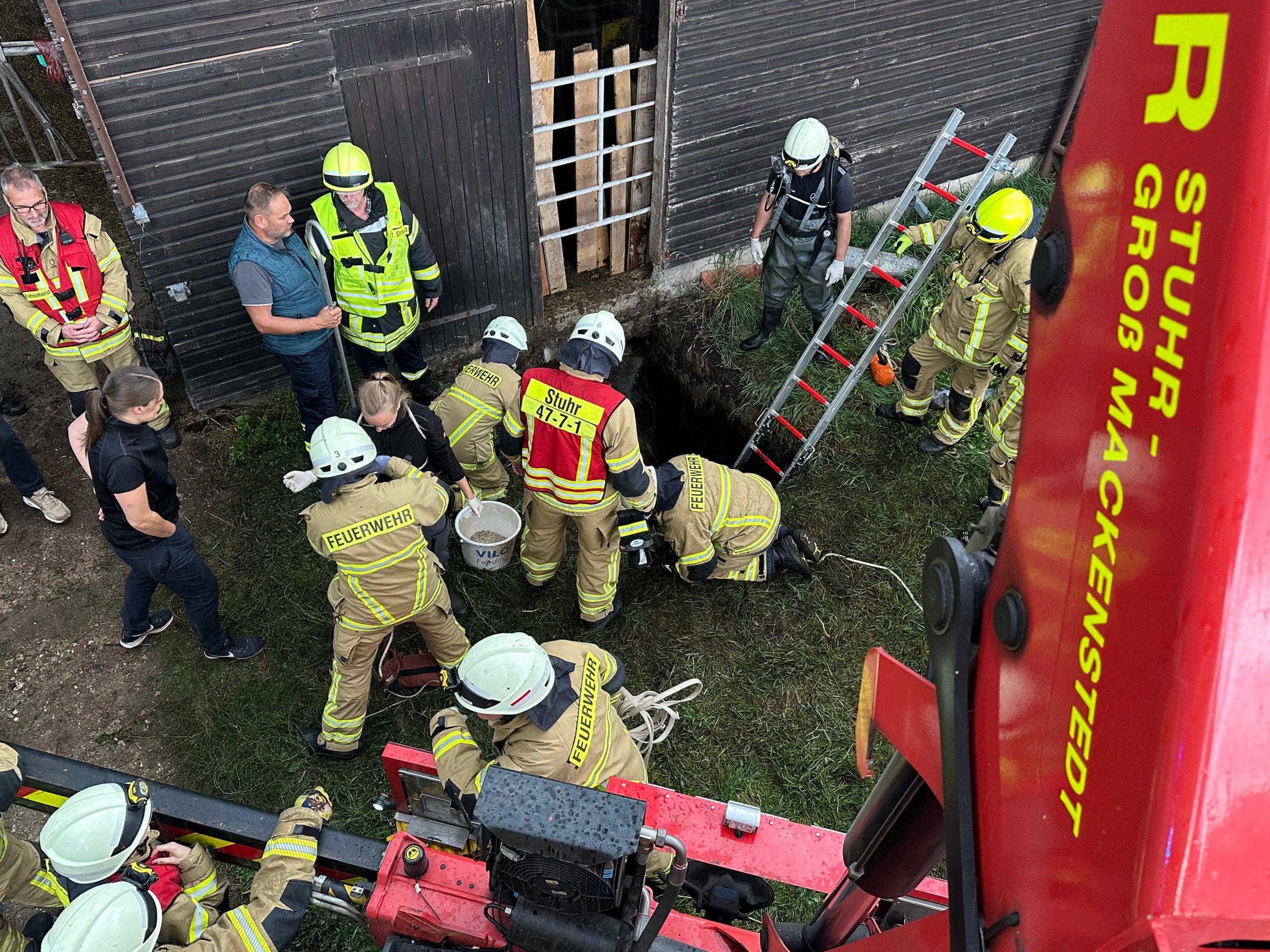 Auf einem Landwirtschaftlichen Betrieb kam es zu einem Betriebsunfall. Eine Kuh ist mit Zwei Personen durch eine Betonabdeckung in einen Gülleschacht gebrochen, dabei wurde eine Person unter der Betonabdeckung mit den Beinen eingeklemmt. Die Person konnte durch schweres Technisches Gerät schnell befreit werden und dem Rettungsdienst übergeben werden. Die Person kam zur weiteren Behandlung in ein Bremer Krankenhaus. Die Zweite Person im Gülleschacht wurde nicht eingeklemmt und konnte mit Hilfe der Feuerwehr diesen eigenständig verlassen.