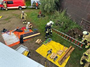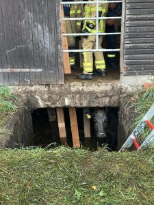 Im weiteren Einsatzverlauf musste die Kuh durch die Fachgruppe Großtierrettung aus dem Gülleschacht gerettet werden. Die Fachgruppe Großtierrettung sicherte die Kuh zunächst um diese dann durch ein Spezielles Hebegeschirr mit dem Rüstwagen – Kran aus dem Gülleschacht in Zusammenarbeit mit einer Tierärztin zu retten. Die Tierärztin begutachtete das Tier abschließend noch einmal. Die Kuh blieb unverletzt und konnte zurück zu Ihrer Herde.