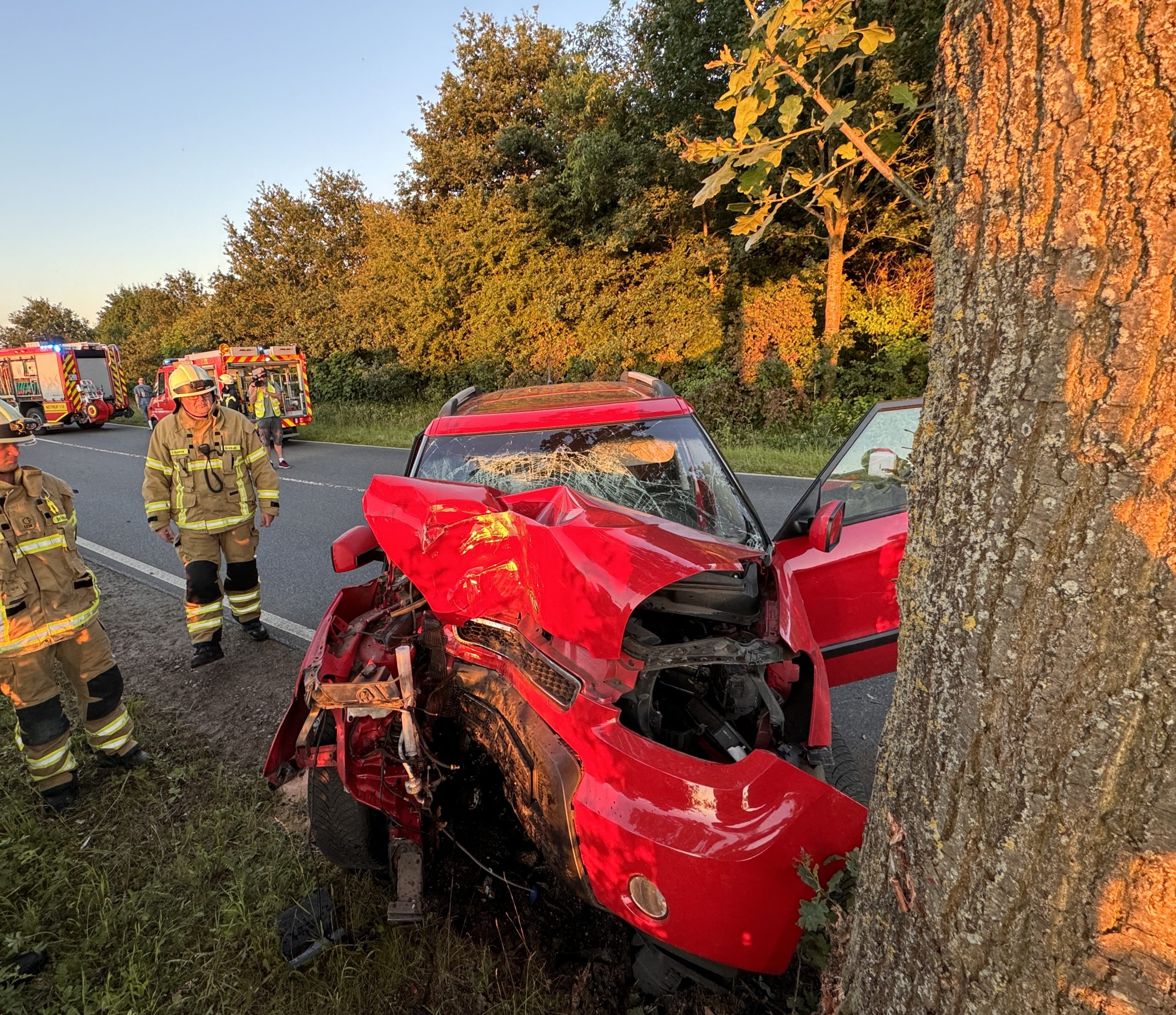 Brinkum-(cm). Die Feuerwehren Brinkum und Gr. Mackenstedt wurden Dienstagabend um 21:15 Uhr zu einem Verkehrsunfall nach Brinkum-Nord gerufen. Auf der Carl-Zeiss-Straße war ein PKW gegen einen Baum geprallt. Der Fahrer sollte laut ersten Meldungen dabei in seinem Fahrzeug eingeklemmt worden sein. Bei Eintreffen der Feuerwehr, hatte der Rettungsdienst bereits eine Sofortrettung durchgeführt und den schwer verletzten Fahrer aus seinem Fahrzeug befreien können. Die Feuerwehr stellte vor Ort den Brandschutz sicher und verhinderte die Ausbreitung von auslaufenden Betriebsstoffen. Des weiteren unterstützten die Kräfte die Polizei bei Absperrmaßnahmen. Nach 90 Minuten war der Einsatz für die Feuerwehr beendet.