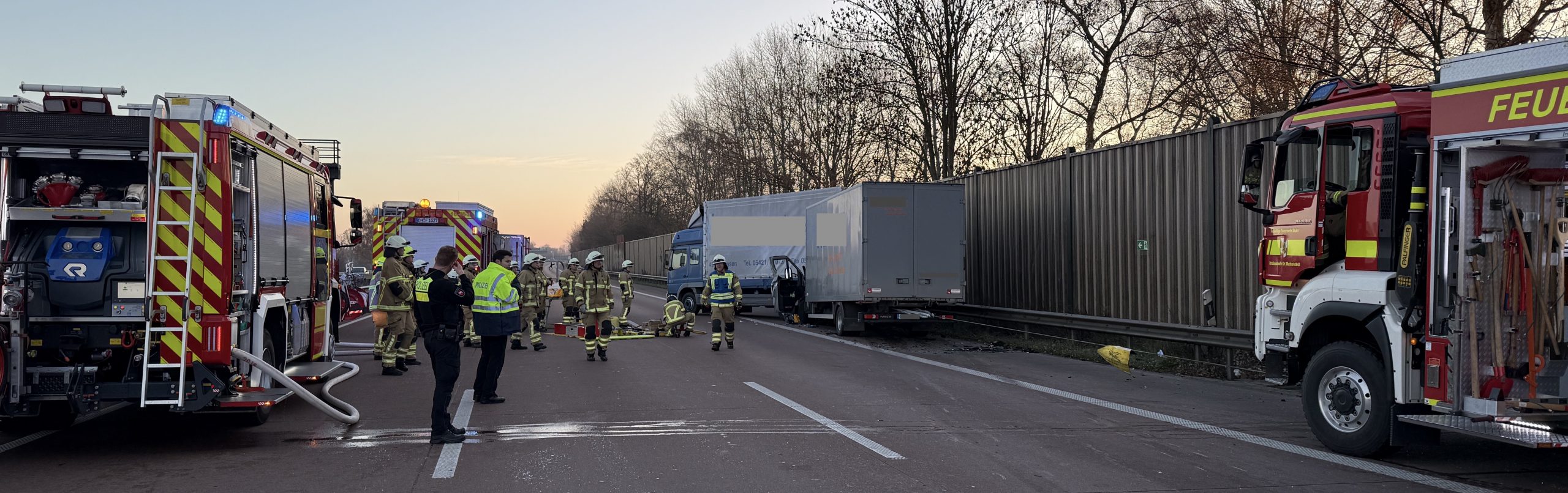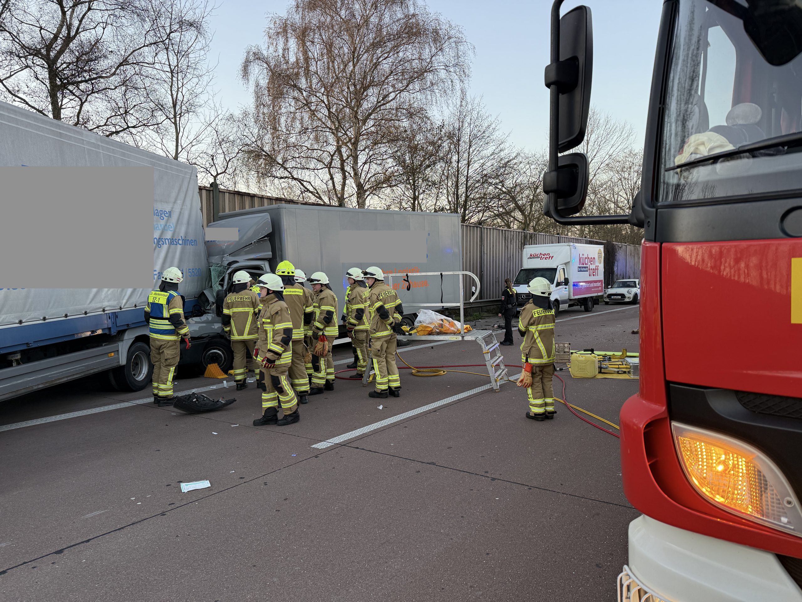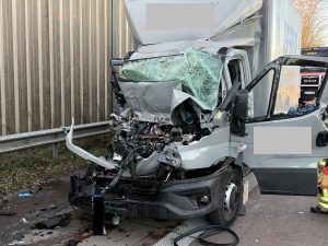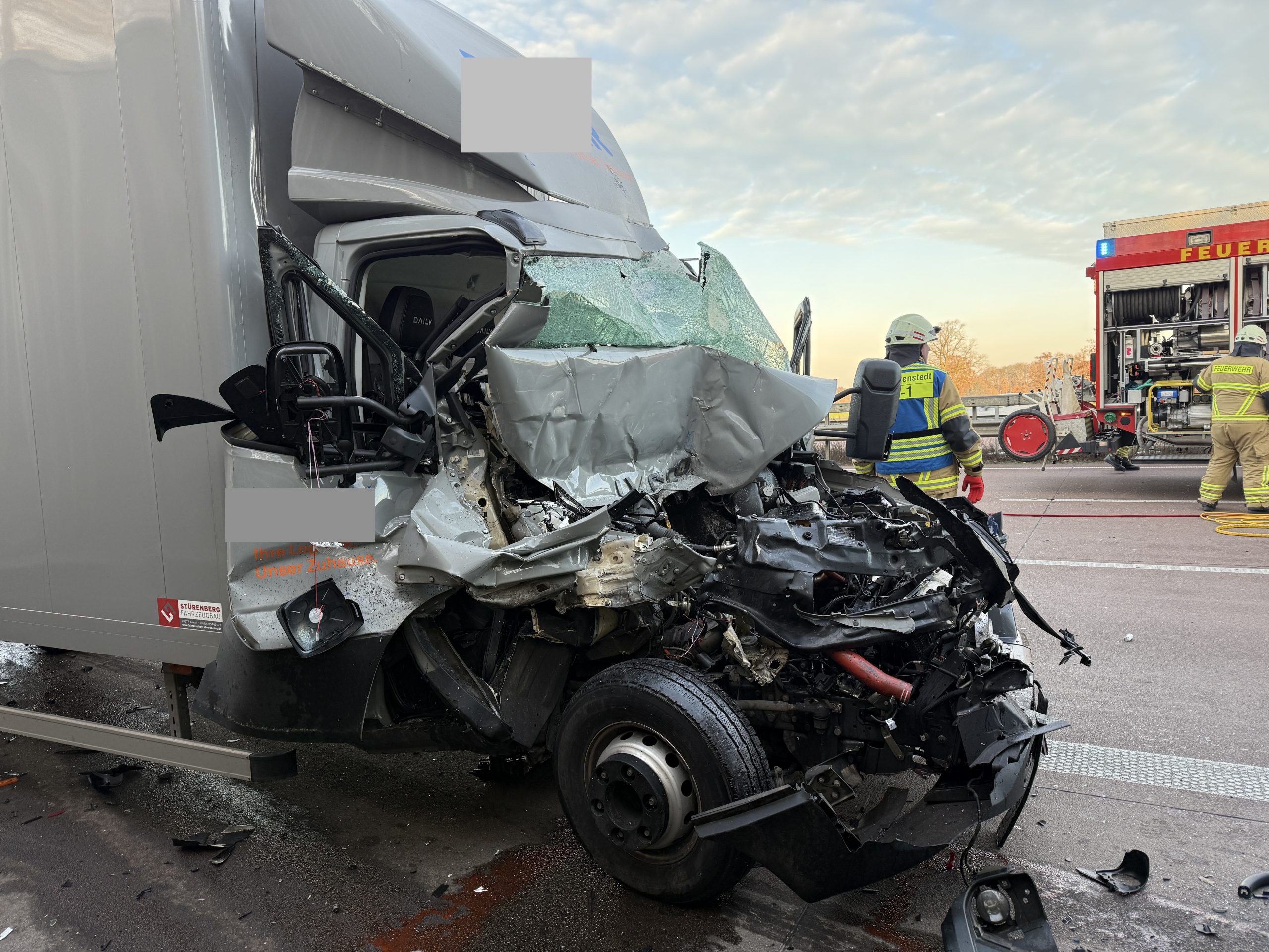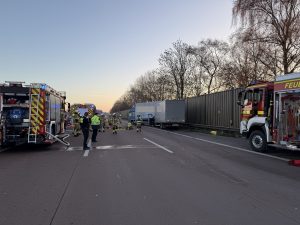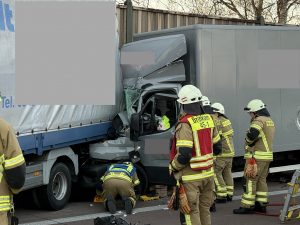 (ct) Heute morgen um 07:47 Uhr wurden die Feuerwehren Gr.Mackenstedt und Brinkum zu einem Verkehrsunfall mit einer eingeklemmten Person alarmiert. Einsatzort war die Autobahn 1 zwischen dem AD Stuhr und der AS Brinkum in Fahrtrichtung Hamburg, ca. 1km hinter dem AD Stuhr. Hier war ein Klein-LKW am beginnenden Stauende auf einen abbremsenden, vorausfahrenden LKW geprallt. Durch die Wucht des Aufpralls wurde die Fahrerkabine stark deformiert und der Fahrer eingeklemmt. Gemeinsam mit dem Rettungsdienst wurde sofort mit der technischen Rettung des Fahrers begonnen. Hierfür kam hydraulisches Rettungsgerät zum Einsatz, um den Fahrer zu befreien. Er konnte nach ca. 30 Minuten befreit und an den Rettungsdienst übergeben werden. Er wurde schwerverletzt und kam zur weiteren Behandlung in ein Krankenhaus. Der Fahrer und der Beifahrer des vorausfahrenden LKW wurden ebenfalls vom Rettungsdienst untersucht, blieben aber unverletzt.