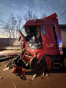 Stuhr – (ps). Heute Morgen um 06:39 Uhr wurden die Feuerwehren Gr. Mackenstedt und Brinkum sowie der Einsatzleitwagen aus Fahrenhorst erneut zu einem schweren Verkehrsunfall mit einer eingeklemmten Person auf die Autobahn 1 alarmiert. Einsatzort war die Autobahn 1 zwischen dem AD-Stuhr und der AS Brinkum in Fahrtrichtung Hamburg. Hier war ein LKW am beginnenden Stauende in einen vorausfahrenden LKW geprallt. Durch die Wucht des Aufpralls wurde die Fahrerkabine stark deformiert sowie der Auflieger abgerissen und der Fahrer eingeklemmt. Ersthelfer betreuten den Fahrer bis zum Eintreffen der Rettungskräfte. Der Fahrer wurde mittels schwerem Technischen Equipments befreit. Er wurde Lebensbedrohlich verletzt und kam zur weiteren Behandlung in ein Krankenhaus. Der Fahrer des anderen LKW wurden ebenfalls vom Rettungsdienst untersucht, blieben aber unverletzt.