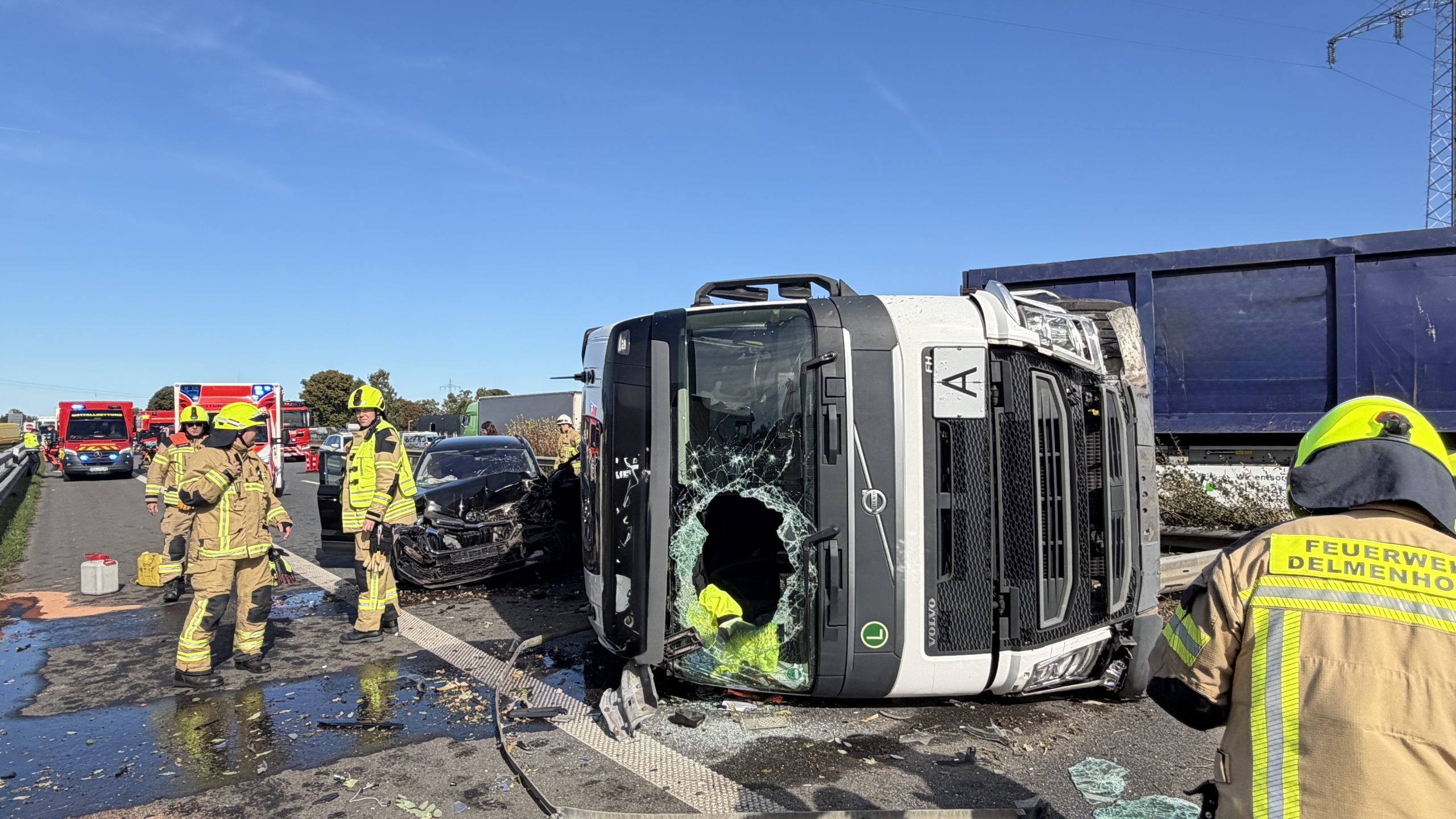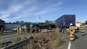 Groß Mackenstedt – (cm). Am heutigen Vormittag um 11:22 Uhr wurden die Feuerwehren Groß Mackenstedt und Brinkum, der Einsatzleitwagen aus Fahrenhorst, die Berufsfeuerwehr Delmenhorst sowie Einheiten des Rettungsdienstes zu einem Verkehrsunfall auf die Bundesautobahn 28 alarmiert. Zwischen der Anschlussstelle Groß Mackenstedt und dem Autobahndreieck Delmenhorst hatte ein Gliederzug die Mittelschutzplanke durchbrochen und ist umgestürzt. Ein Pkw auf der Gegenfahrbahn kollidierte mit dem Lkw. Laut erster Meldung sollten dabei Personen im Fahrzeug eingeklemmt worden sein. Diese Meldung bestätigte sich vor Ort jedoch nicht. Die beiden Fahrer konnten ihre Fahrzeuge eigenständig verlassen und wurden nach der Erstversorgung durch den Rettungsdienst ins Krankenhaus transportiert. Die Feuerwehr verhinderte die Ausbreitung auslaufender Betriebsstoffe und führte verkehrssichernde Maßnahmen durch. Nach etwa einer Stunde war der Einsatz für die Feuerwehr beendet.