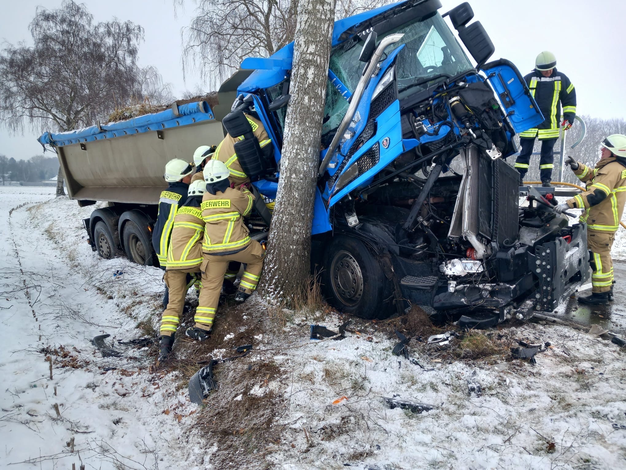 (ct) Heute vormittag um 10:40 Uhr wurden die Feuerwehren Fahrenhorst und Gr.Mackenstedt zu einem Verkehrsunfall alarmiert. Einsatzort war die Wildeshauser Straße im Ortsteil Fahrenhorst. Gemeldet wurde, dass ein LKW-Fahrer nach einer Kollision mit einem Baum in seinem Fahrerhaus eingeschlossen sein sollte. Das Fahrzeug war in einer Linkskurve nach rechts von der Fahrbahn abgekommen und mit einem Baum kollidiert.