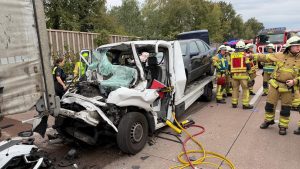 Beim Eintreffen der Einsatzkräfte bestätigte sich die gemeldete Lage. Ein Kleintransporter, der mit einem PKW Beladen war, hatte augenscheinlich das Stauende übersehen und war auf einen Sattelzug, der an diesem Stand, aufgefahren.