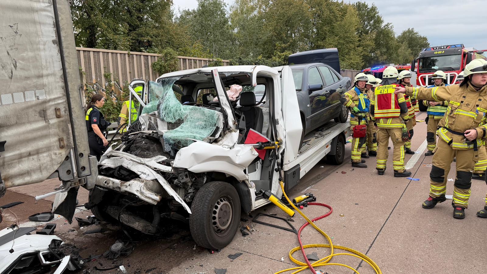 Der Fahrer des Kleintransporters wurde in seinem Fahrzeug eingeklemmt und lebensbedrohlich verletzt.