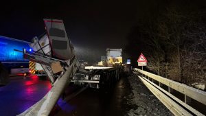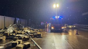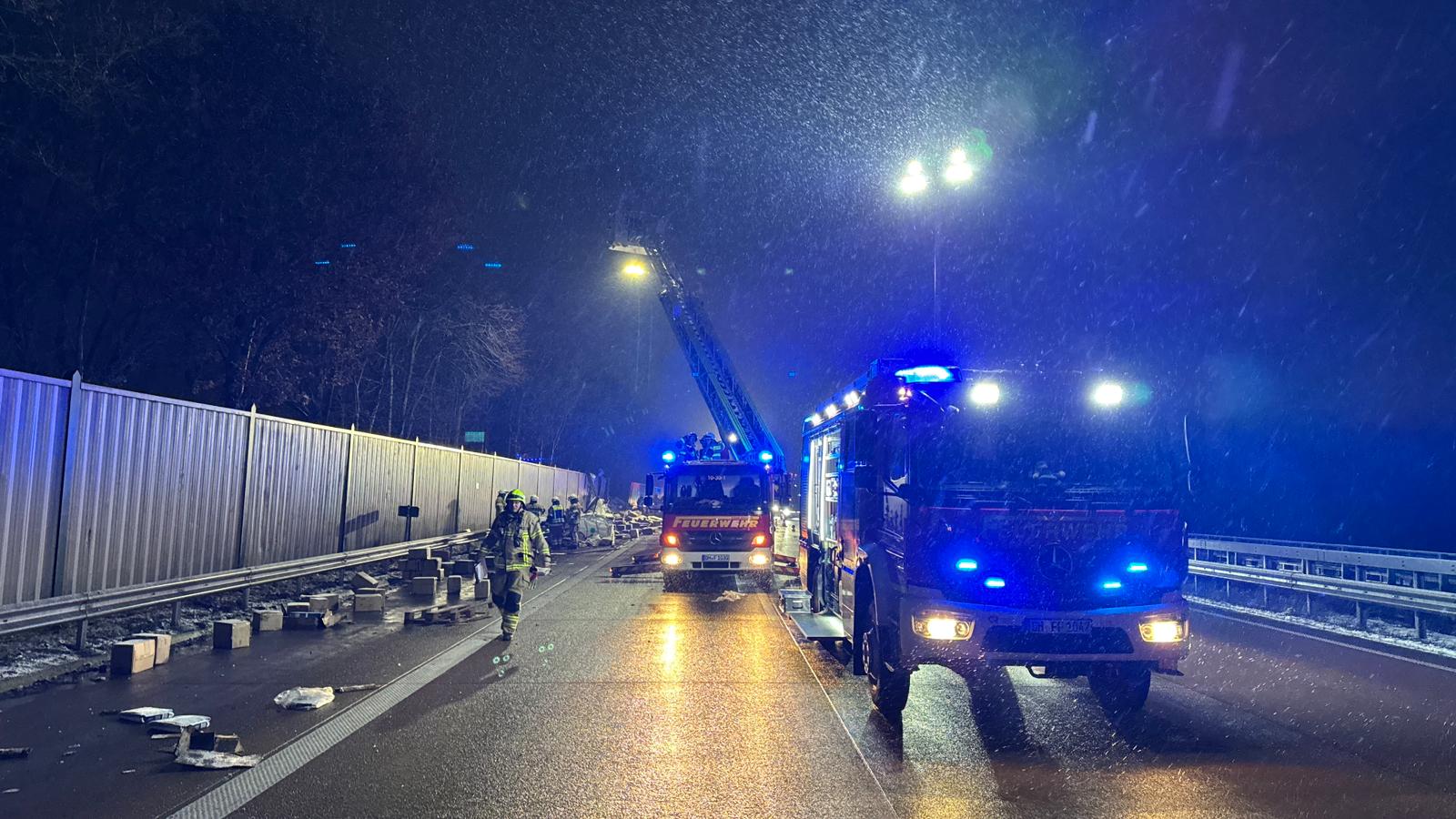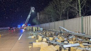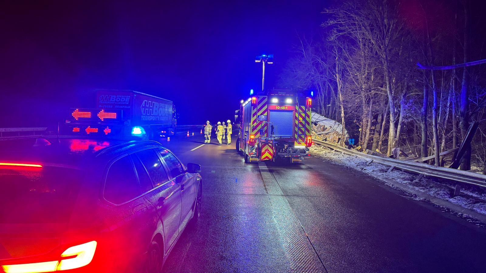 Zunächst war unklar, ob der LKW die Leitplanke durchbrochen haben soll. Durch die erst eintreffenden Einsatzkräfte konnte nach Erkundung schnell Entwarnung gegeben werden. Der LKW touchierte die Leitplanke und die Lärmschutzwand, wobei diese und der Auflieger massiv beschädigt wurden ist. Dabei verlor der LKW fast die komplette Ladung, wodurch sämtliches Stückgut über ungefähr 150 Meter auf den rechten beiden Fahrstreifen verteilt war. Somit sicherte die Feuerwehr die rechten beiden Fahrstreifen ab und leuchtete die Unfallstelle aus. Auslaufende Betriebsstoffe wurden ebenso aufgebunden, damit diese nicht in die Kanalisation gelangen.
