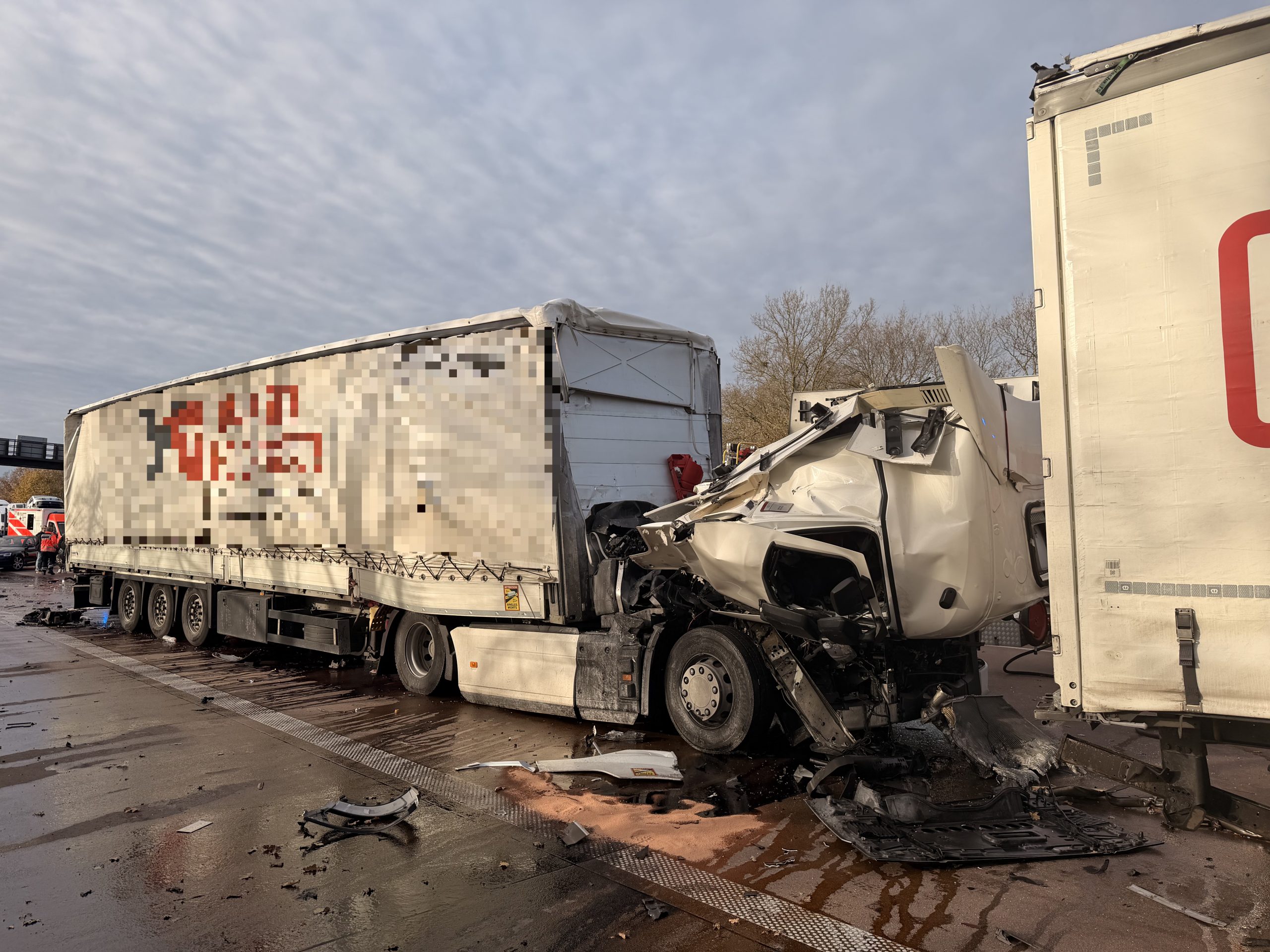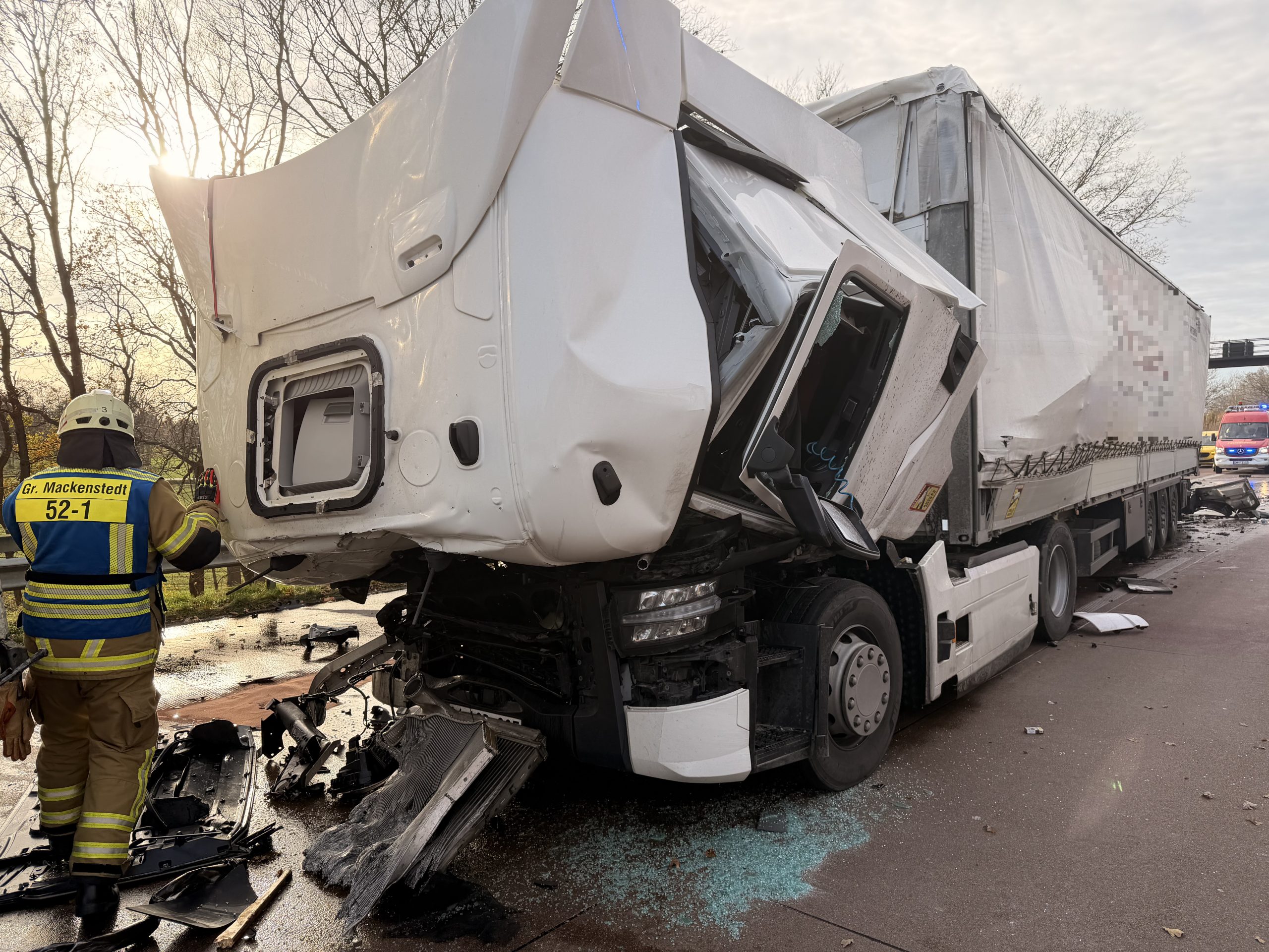 Stuhr – (ps). Mittag um 12:34 Uhr wurden die Feuerwehren Gr. Mackenstedt und Brinkum sowie der Einsatzleitwagen aus Fahrenhorst erneut zu einem schweren Verkehrsunfall mit einer eingeklemmten Person auf die Autobahn 1 alarmiert. Einsatzort war die Autobahn 1 zwischen dem AD-Stuhr und der AS Brinkum in Fahrtrichtung Hamburg, ca. 2km hinter dem AD-Stuhr. Hier war ein LKW am beginnenden Stauende in einen vorausfahrenden LKW geprallt, durch die Wucht des Aufpralls wurden 4 LKW bei dem Unfall beschädigt. Durch die Wucht des Aufpralls wurde die Fahrerkabine stark deformiert sowie abgerissen und der Fahrer eingeschlossen. Ersthelfer der Bundespolizei befreiten den Fahrer und betreuten diesen bis zum Eintreffen der Rettungskräfte. Er wurde schwerverletzt und kam zur weiteren Behandlung in ein Krankenhaus. Die Fahrer der anderen LKW wurden ebenfalls vom Rettungsdienst untersucht, blieben aber unverletzt.