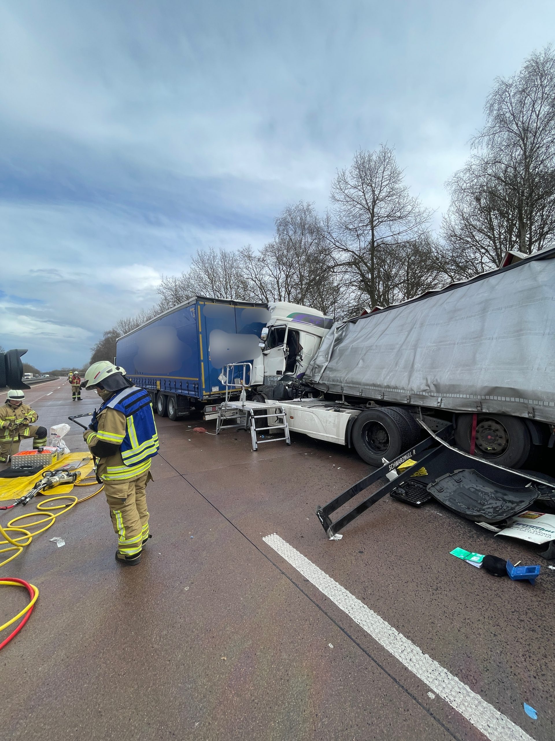 Vor Ort war es zu einem Auffahrunfall zwischen drei Lastkraftwagen gekommen. Der Fahrer des vorderen Lkw erlitt leichte Verletzungen. Die beiden Fahrer der folgenden Fahrzeuge wurden hingegen in ihren Führerhäusern schwer eingeklemmt und mussten mit hydraulischem Rettungsgerät befreit werden. Beide wurden schwer verletzt; Lebensgefahr kann nach aktuellem Stand nicht ausgeschlossen werden.