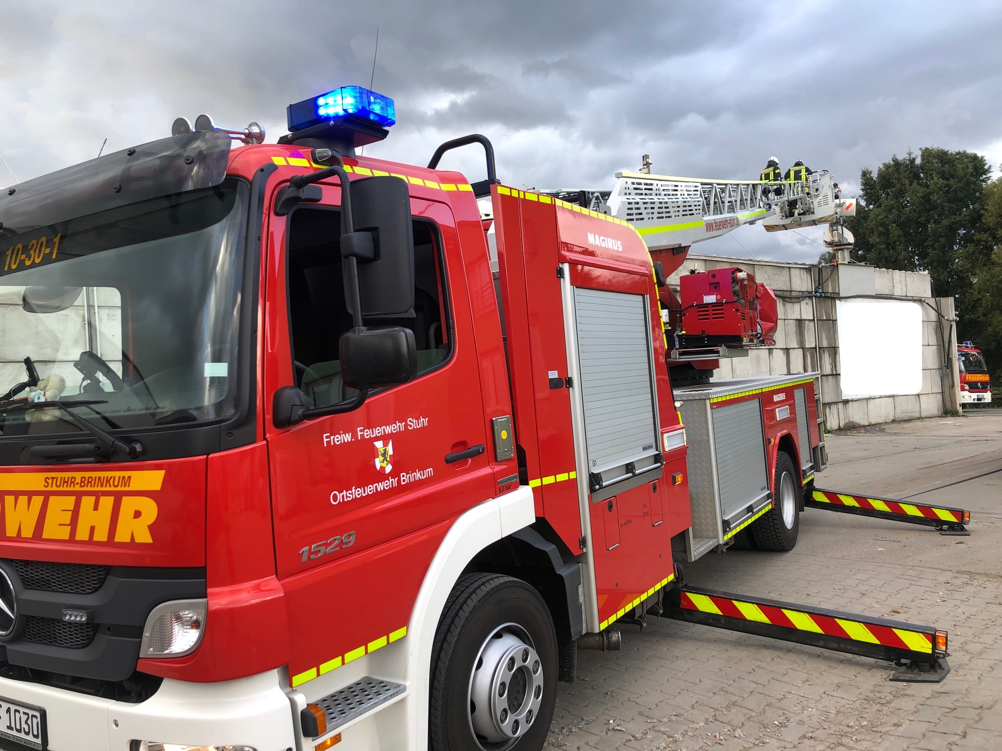 Brinkum-(nk) Am Samstagabend wurde die Feuerwehr Brinkum und der Rettungsdienst zu einer Feuermeldung in den Rodendamm gerufen. Ein aufmerksamer Verkehrsteilnehmer hatte beim Vorbeifahren eine Rauchentwicklung auf einem Recyclinghof entdeckt und wählte darauf hin den Notruf. Die Einsatzkräfte kontrollierten die Einsatzstelle mit Wärmebildkamera und Drehleiter und konnten schnell Entwarnung geben. Bei der gemeldeten Rauchentwicklung handelte es sich  glücklicherweise nur um Wasserdampf. Somit konnte der Einsatz nach 45 Minuten wieder beendet werden.
