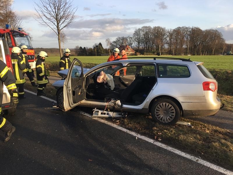 Nach einem Frontalzusammenstoß zweier PKW auf der Dorfstraße in Kirchseelte hinter dem Ortsausgang in Richtung Harpstedt war eine Person in ihrem PKW eingeklemmt. Einsatzkräfte der Ortsfeuerwehr Gr. Mackenstedt konnten diese erst mit hydraulischem Rettungsgerät zeitaufwendig aus dem stark deformierten Fahrzeug befreien.