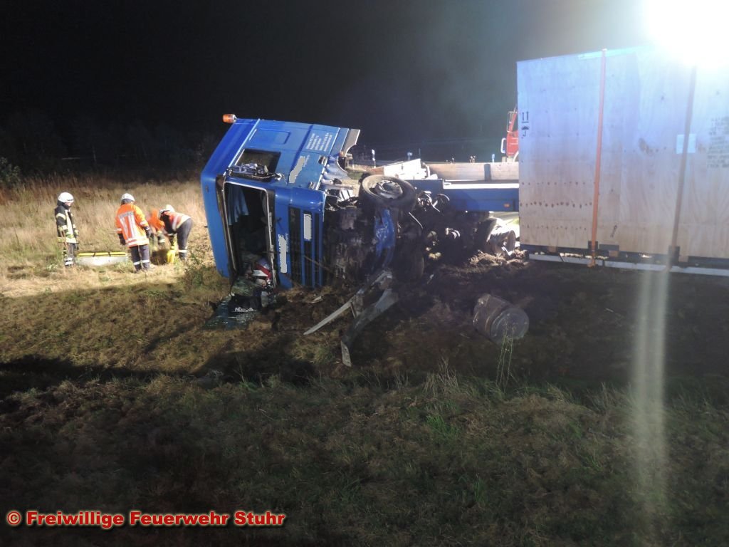 (ct) Um 2:55 Uhr wurde die Ortsfeuerwehr Gr.Mackenstedt über Sirene und Meldeempfänger zu einem Verkehrsunfall alarmiert. Gemeldet wurde ein LKW-Unfall mit eingeklemmter Person auf der BAB1 in Fahrtrichtung Brinkum. Aus Fahrtrichtung Osnabrück kommend ist ein Schwertransporter im Bereich des Autobahndreiecks Stuhr auf Höhe der Abfahrt auf die BAB28 aus bisher unbekannter Ursache von der Fahrbahn abgekommen und durch die Leitplanke in den Grünstreifen gefahren. Hierbei wurde die Zugmaschine abgerissen und schwer beschädigt. Der ca. 66 jährige Fahrer war im Fahrerhaus leicht eingeklemmt und bei Eintreffen der Einsatzkräfte nicht mehr ansprechbar. Er konnte nach kurzer technischer Rettung von der Feuerwehr befreit und an den Rettungsdienst übergeben werden. Leider war er so schwer verletzt, dass für ihn jede Hilfe zu spät kam. Der Fahrer und die Beifahrerin des Begleitfahrzeugs, die direkt hinter dem LKW fuhr und alles mit ansehen musste, erlitt einen Schock und wurde durch den Rettungsdienst vor Ort betreut. Im weiteren Einsatzverlauf wurde durch die Feuerwehr der Brandschutz sicher gestellt und die Einsatzstelle ausgeleuchtet. Da größere Mengen Dieselkraftstoff ausgetreten sind, wurde durch die Polizei eine Entsorgungsfirma an die Einsatzstelle gerufen. Im Anschluss an den Feuerwehreinsatz hat die Polizei mit einer umfangreichen Spurensicherung begonnen. Zur Erstellung von Übersichtsaufnahmen von Oben und zur weiteren Ausleuchtung der Einsatzstelle wurde dann noch die Drehleiter der Ortsfeuerwehr Brinkum nachalarmiert. Da der Streckenabschnitt zum Einsatzgebiet der Ortsfeuerwehr Harpstedt gehört, wurde diese ebenfalls alarmiert, mußte allerdings nicht mehr anrücken. Zur Bergung des Schwertransporters wurde ein privates Bergungsunternehmen beauftragt. Die Bergungsarbeiten werden sich vermutlich noch bis in den späten Vormittag hineinziehen. Der Einsatz der Feuerwehr konnte gegen 6 Uhr beendet werden.