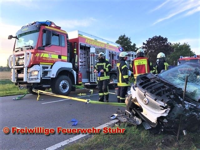 (ct) Heute Morgen um 6:37 Uhr wurden die Feuerwehren Groß Mackenstedt und Brinkum zu einem Verkehrsunfall alarmiert. Einsatzort war die Carl-Zeiss-Straße zwischen Brinkum-Nord und Stuhrbaum. Gemeldet wurde ein Verkehrsunfall mit einem Pkw und zwei beteiligten LKW. Vor Ort eingetroffen wurde festgestellt, dass ein PKW frontal mit einem LKW kollidiert war. Aus bisher ungeklärter Ursache war der PKW aus Brinkum kommend nach links auf die Gegenfahrbahn gekommen und dort frontal mit einem LKW kollidiert. Dadurch wurde die Beifahrerseite teilweise aufgerissen. Der Smart wurde dabei herumgeschleudert und kollidierte dadurch mit einem weiteren LKW. Im Anschluss kam der PKW im rechten Seitengraben zum stehen. Der 42-jährige Fahrer des Smart war in seinem Fahrzeug eingeschlossen und wurde schwer verletzt. Der erste LKW kam durch die Kollision nach links von der Fahrbahn ab und durchschlug einen Wildschutzzaun.