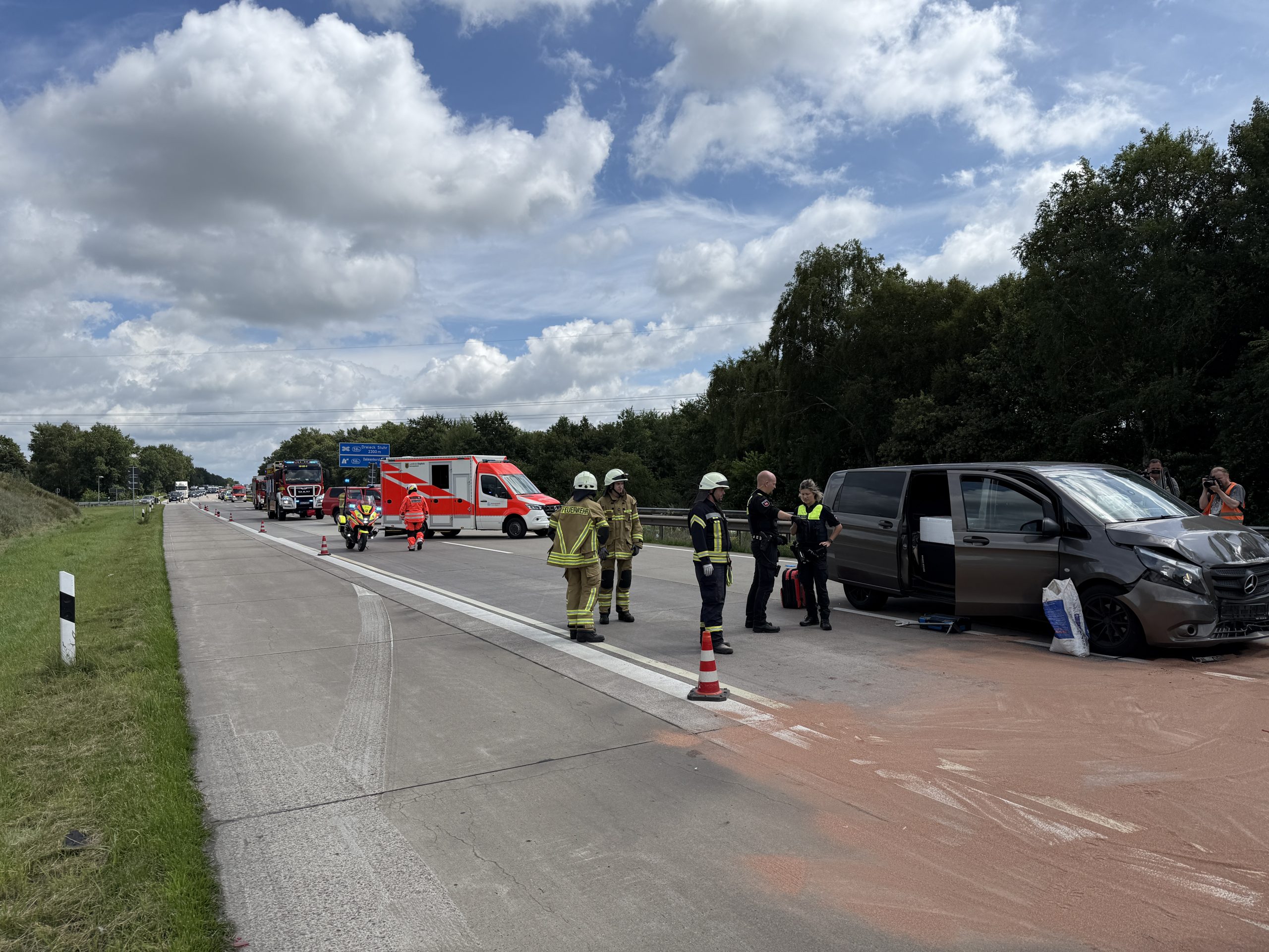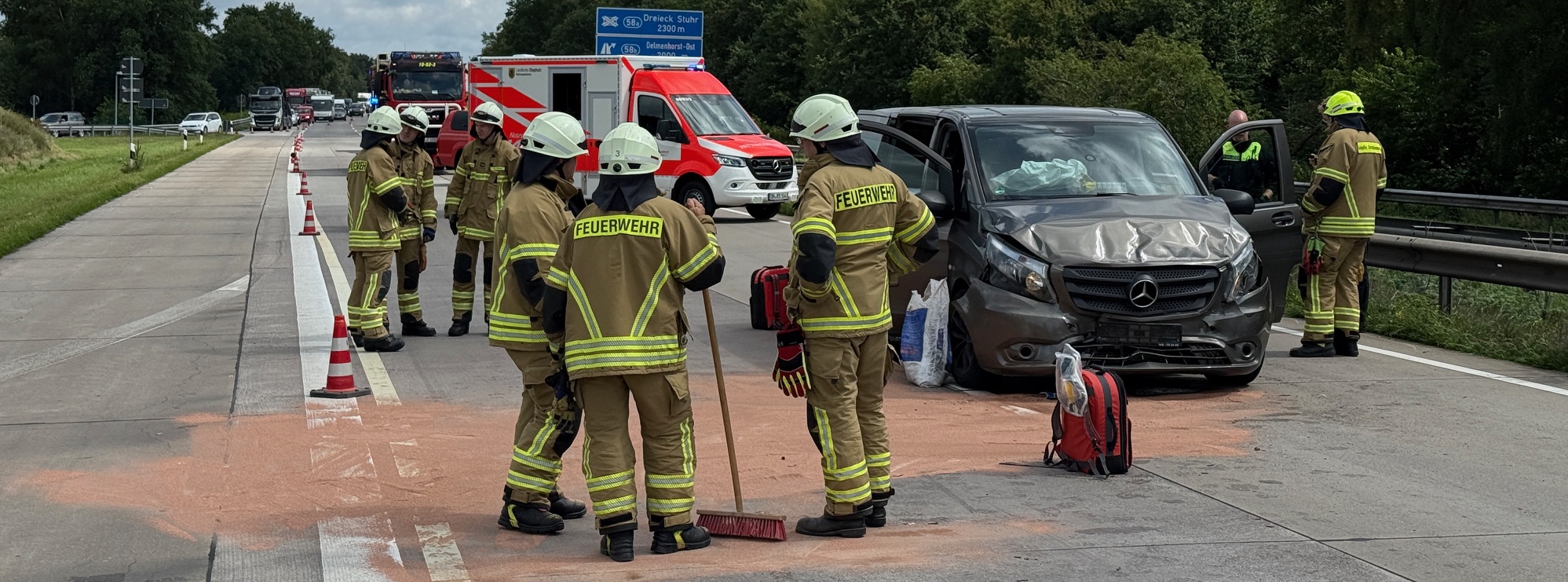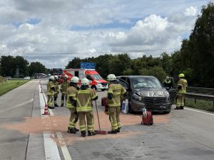 (ct) Heute Mittag um 11:53 Uhr wurden die Feuerwehren Brinkum und Gr.Mackenstedt mit dem Stichwort „Verkehrsunfall – unklare Lage“ auf die Autobahn alarmiert. Einsatzort war die BAB1, Fahrtrichtung Osnabrück zwischen dem AD Stuhr und der AS Gr.Ippener. Vor Ort eingetroffen wurde ein Verkehrsunfall zwischen zwei PKW vorgefunden. Beteiligt waren zwei Mercedes Vito. In dem ersten PKW saßen 7 Personen, zwei Erwachsenen und 5 Kinder. In dem zweiten PKW saßen 2 Erwachsene.