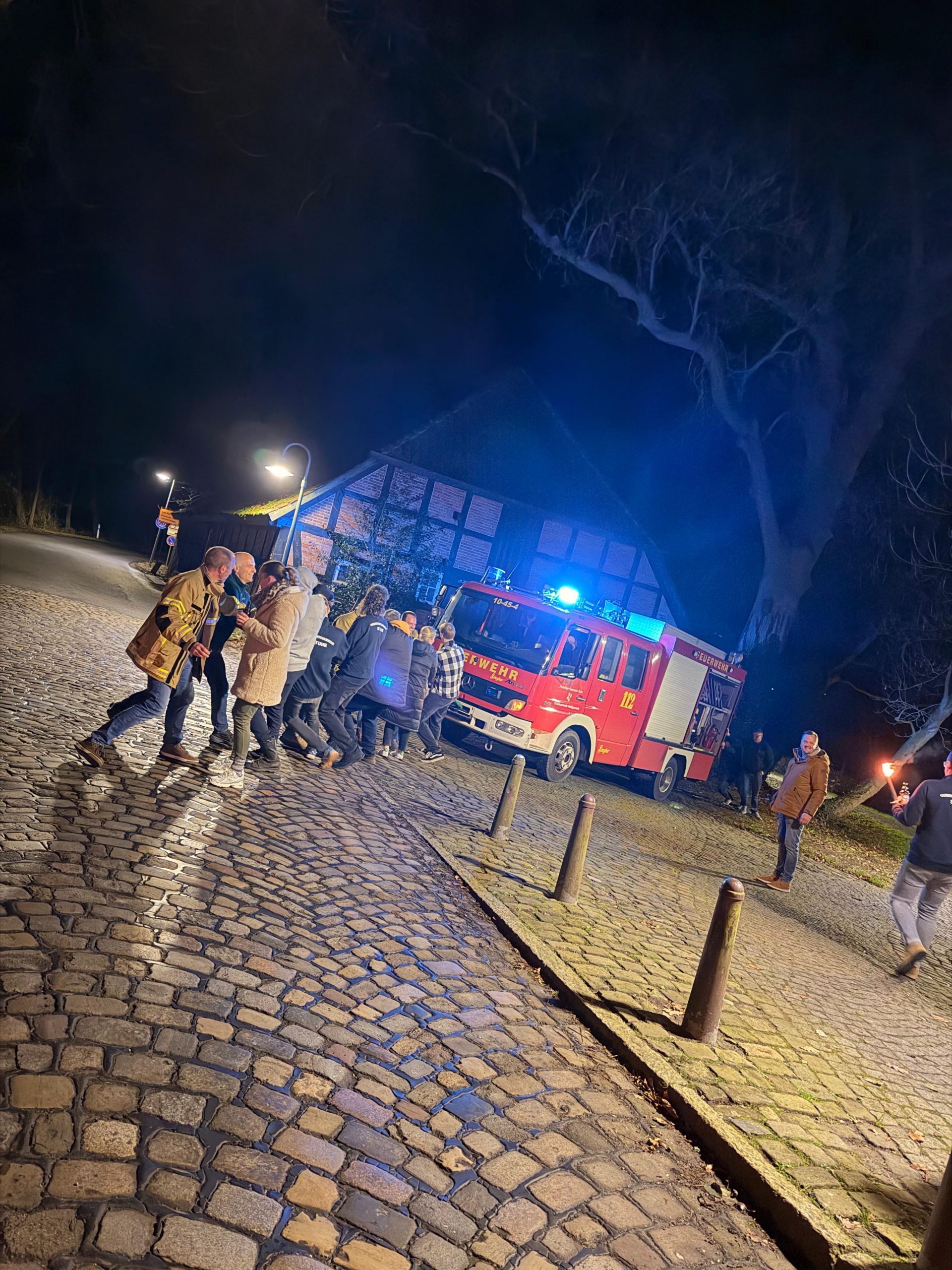 Am frühen Abend unterstützte die Feuerwehr anschließend den traditionellen Laternenumzug in Heiligenrode. Nach einer St.-Martins-Andacht an der Klosterkirche St. Marien führte der Zug über die Fanger Straße, den Ulmenweg und die Maifeldstraße zurück zur Kirche. Begleitet wurde der Zug an der Spitze von Mitgliedern der Jugendfeuerwehr Groß Mackenstedt/Heiligenrode.