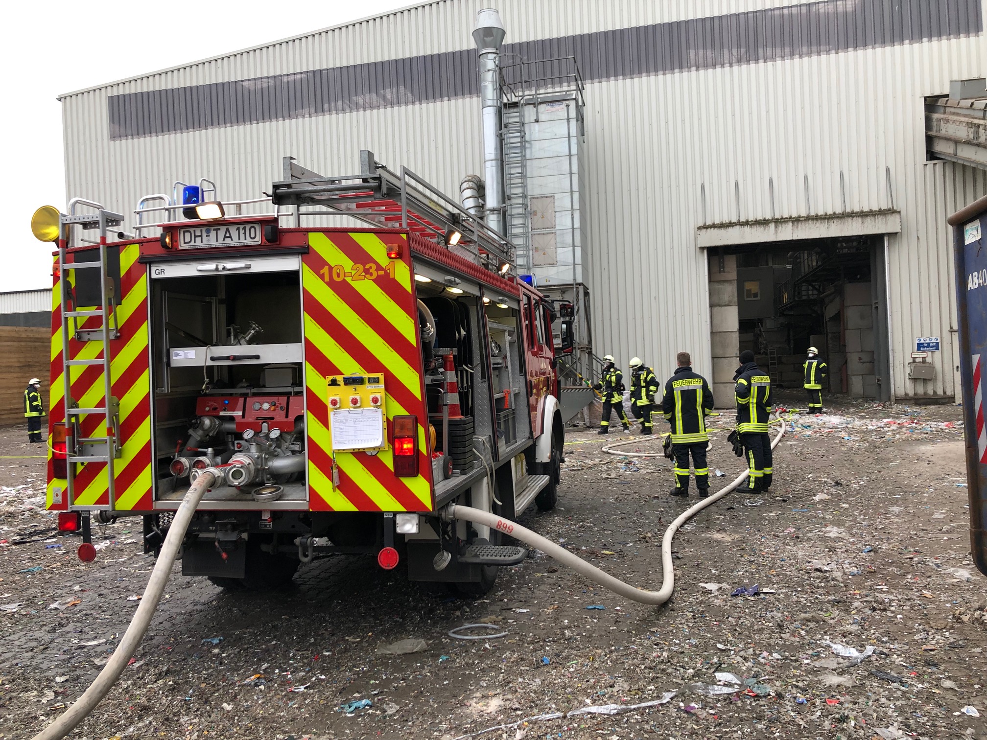 Noch vor dem Ausrücken meldeten Anwohner über den Notruf 112 eine Rauchentwicklung aus einer Halle, so dass die Alarmierung auf Sirenenalarm erhöht worden war. Bei Eintreffen stellten die Einsatzkräfte eine Rauchentwicklung aus einer Sortierhalle fest. Mehrere Atemschutztrupps gingen in die Halle zur Brandbekämpfung vor. In der Halle brannte eine Müll-Sortieranlage. Nach einer Stunde war der Brand gelöscht. Nach 2,5 Stunden waren auch die Nachlöscharbeiten abgeschlossen und der Einsatz konnte beendet werden. Ein Rettungswagen stand für die Dauer des Atemschutzeinsatzes in Bereitstellung.