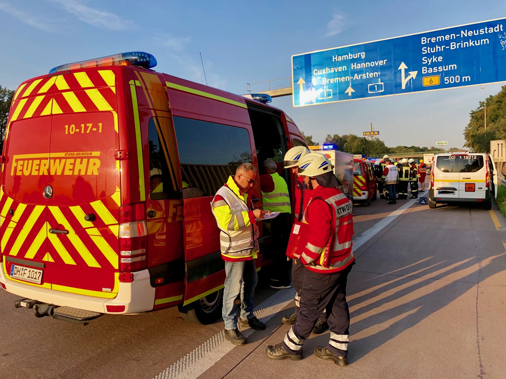 Kurz vor der Anschlussstelle Brinkum, in Fahrtrichtung Hamburg, kam es zu einem Auffahrunfall zwischen drei Kleinbussen einer Reisegruppe. Die Kräfte der Feuerwehr führten Sicherungsmaßnahmen durch und unterstützten den Rettungsdienst bei der Patientenversorgung und der Transportorganisation. Insgesamt mussten 21 leichtverletzte Personen, in umliegende Krankenhäuser transportiert werden. Hierfür wurden acht Rettungswagen, ein Notarzteinsatzfahrzeug sowie zwei Mannschaftstransportwagen der Feuerwehr eingesetzt. Die DRK-Bereitschaft Brinkum wurde zur Besetzung der Unterkunft für einen möglichen Betreuungseinsatz alarmiert. Nach zirka zwei Stunden konnte der Einsatz beendet werden.