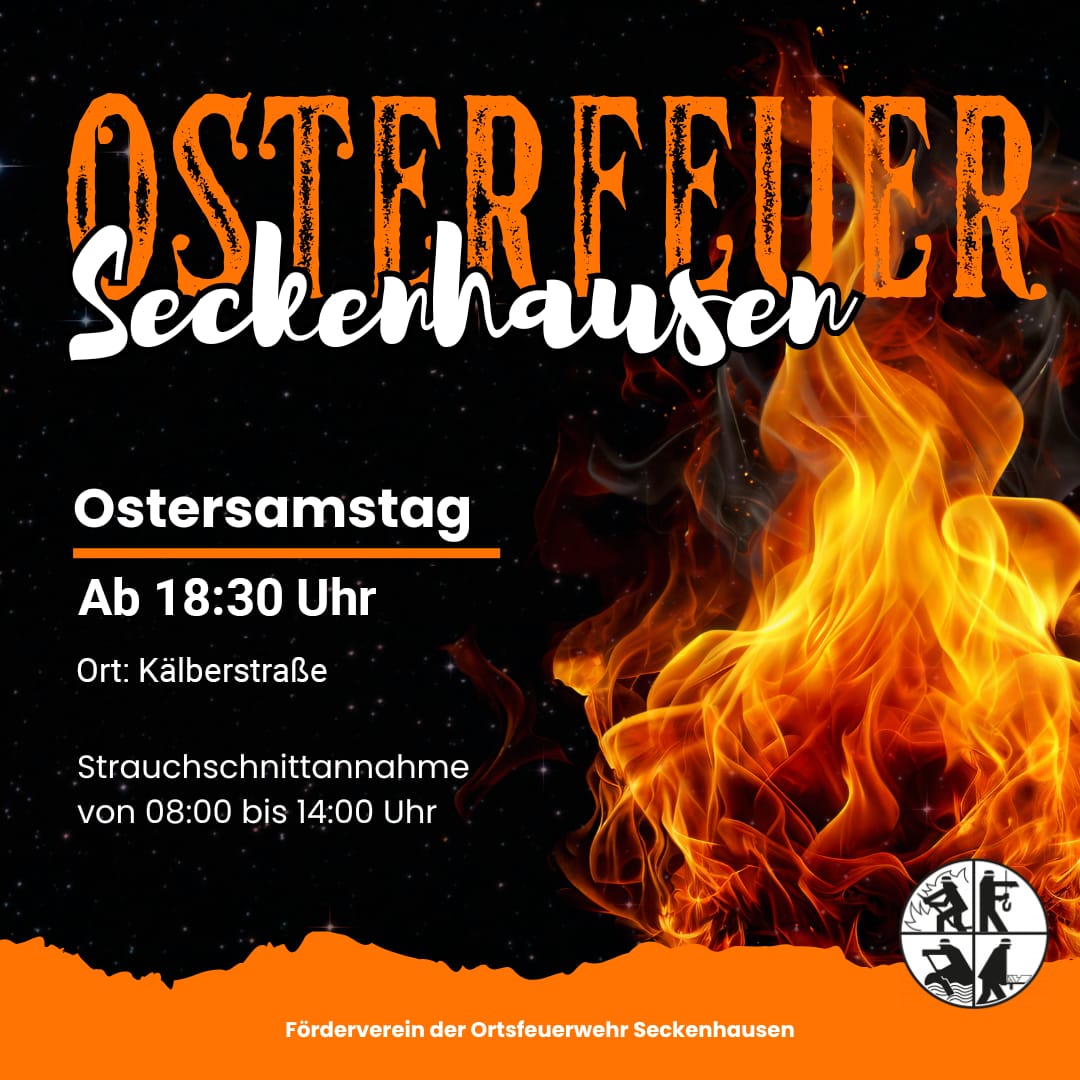 Seck.-(CH) In Seckenhausen findet das diesjährige Osterfeuer in der Kälberstraße ab 18:30 statt. Für leibliches wohl ist wie immer gesorgt, der Strauchschnitt wir diese Jahr von 08:00 bis 14:00 Uhr angenommen.